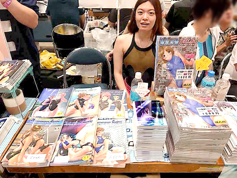 当日は『競泳水着Fetish』を委託頒布されていたカツオ師匠が早々にスペースを整えて下さり、緊張と披露と準備された充電式ハンディ扇風機の当てすぎで腹具合が崩壊され、トイレに籠城されている間に私と売り子さんをして下さったフェチ系女優「ノア」さんが入場を果たし、スペースづくりを始めました。